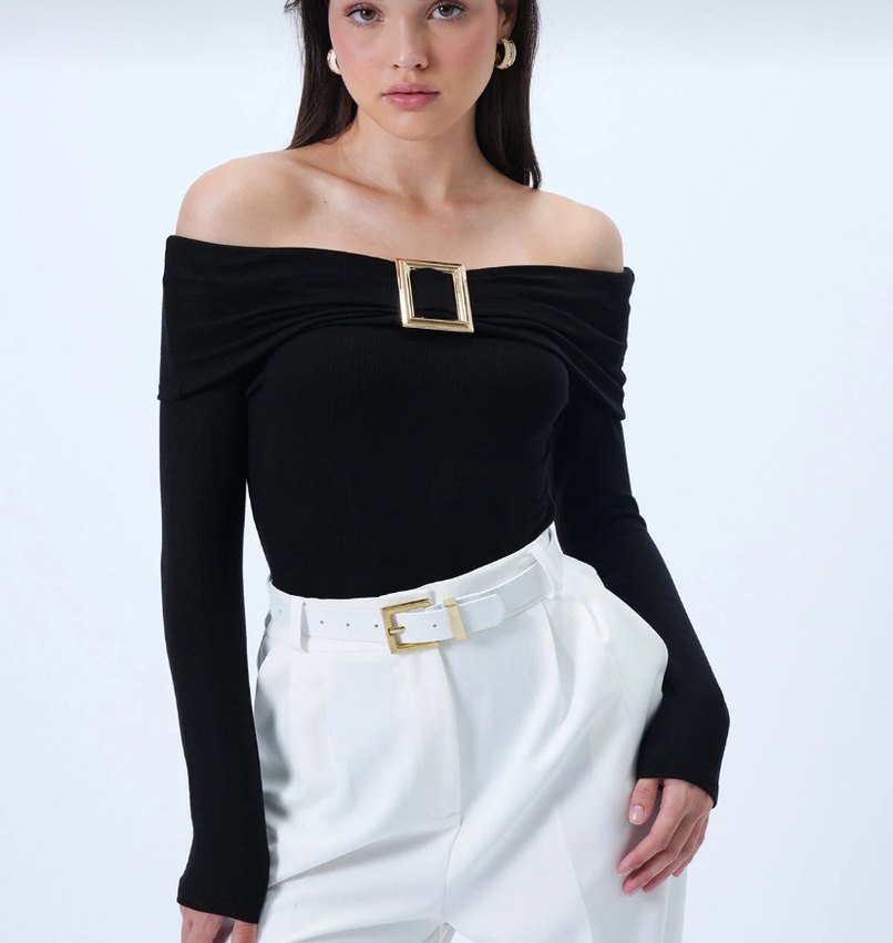 Kayık yaka ve uzun kollu, kemer detaylı, siyah, vücuda oturan kadın bluz. Pürüzsüz sentetik kumaştan, modern ve ofis kullanımına uygun.