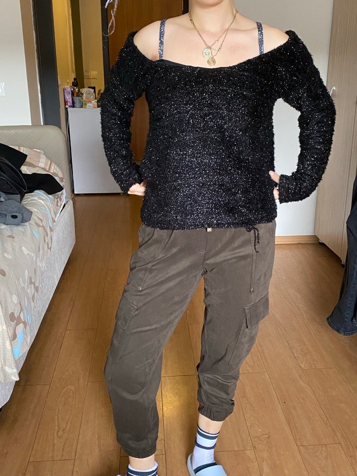 Kadınlar için kayık yaka, uzun kollu, bol kesim siyah triko kazak. Günlük kullanıma uygun, rahat ve şık.