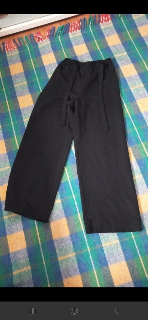 Kadınlar için siyah, kemerli, bol kesim midi uzunlukta kumaş pantolon. Yumuşak ve sıcak dokulu, günlük rahat sokak stili için uygundur.