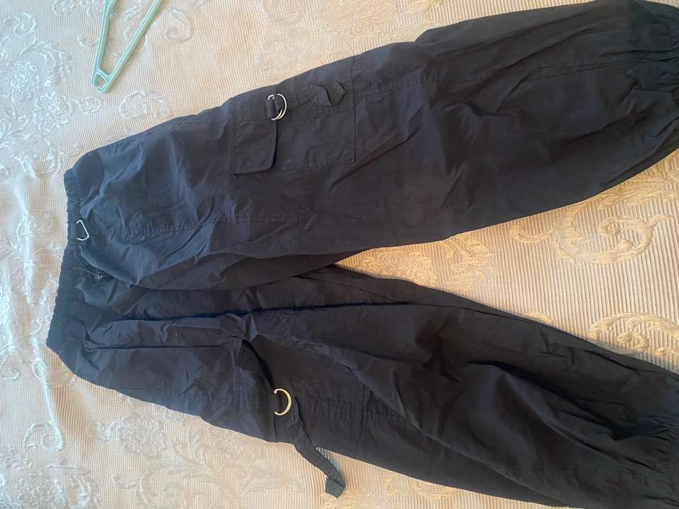 Kemerli, bol kesim siyah lastikli pantolon , sokak stili ve dış mekan kullanımı için uygundur.