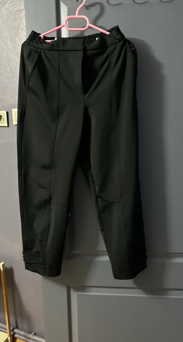 Siyah kemerli, dar kesim, midi boy kadın kumaş pantolon. Sentetik kumaştan üretilmiş, sokak stili ve athleisure için uygun.