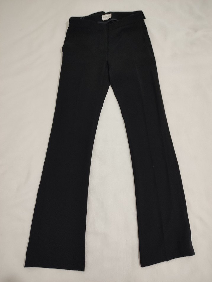 Kadınlar için siyah denim kumaştan, kemerli ve normal kesim pantolon. Ofis ve günlük kullanıma uygundur.