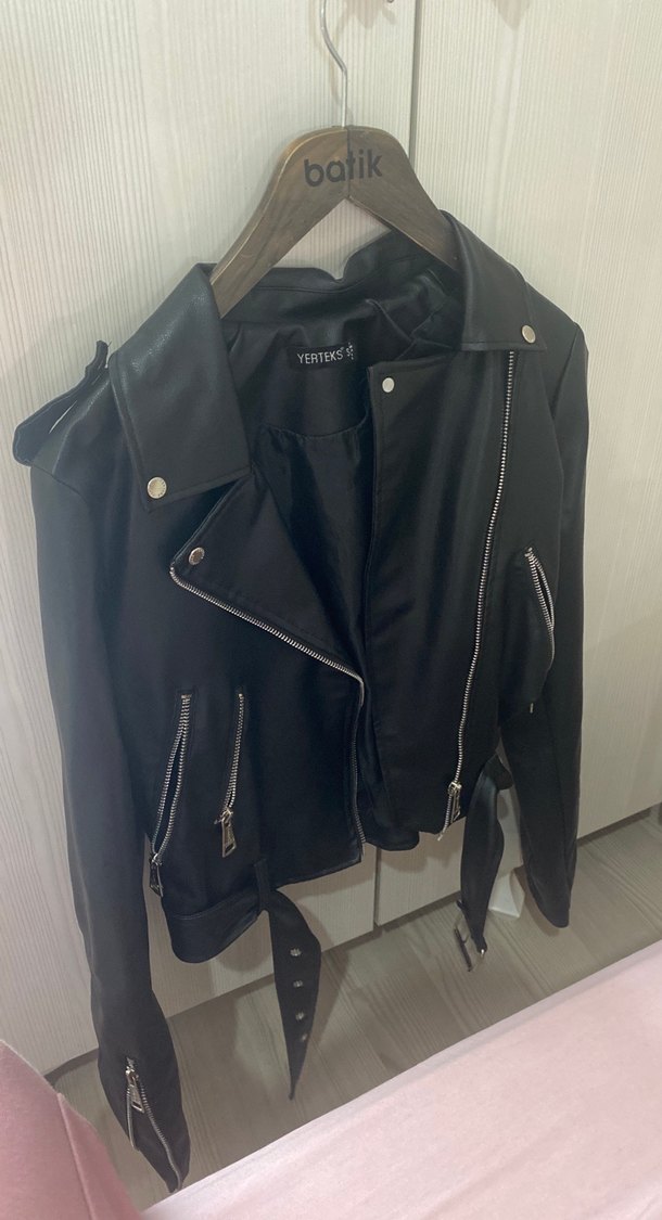 Siyah deri biker ceket, kemerli ve kısa boylu. Notlu yaka ve askılı kolları var. Günlük kullanım için uygun, düzenli kesim. Marka: YERTEXS'S.