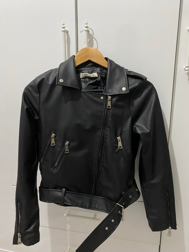 Dar kesim siyah deri biker ceket, kesimli yaka, askılı kollar ve kemerli bel detayına sahiptir. Etiketi biraz hasar görmüş onun dışında herhangi bir problem yok az giyildi.