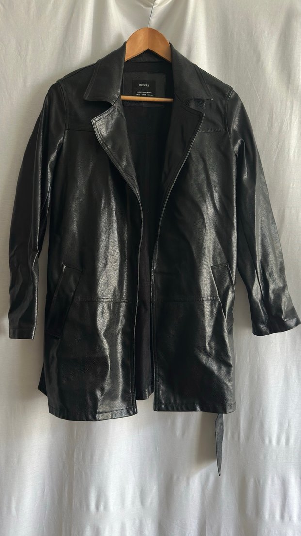 Siyah deri, kemerli midi ceket. Normal kesim ve günlük kullanıma uygun. 2 adet defosu var görsellerini koydum. kolunda minik bir yırtık var dikilebilir bide ense kısmında dolabımda çok uzun zaman kullanılmadan kaldığı için dökülme var. Bu yüzden fiyatını uygun tutuyorum. Son görselde ürünün ölçüleri mevcut.