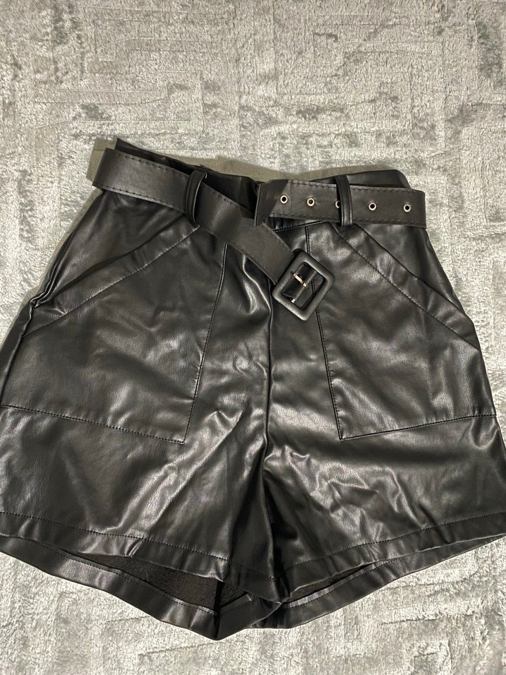 Siyah deri kemerli mini şort, sokak stili ve günlük kullanım için uygundur. Düz dokulu, trend ve rahat kesim. Hiç giyilmedi sorunsuzdur