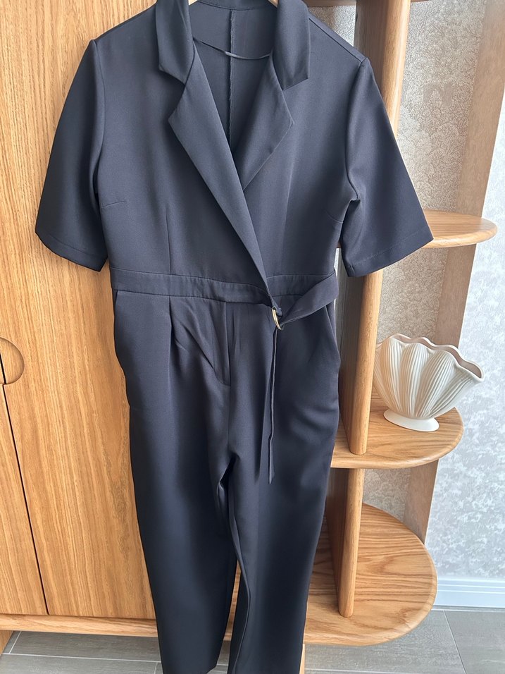 Kadın tulumu, notlu yaka, kısa kollu ve kemerli bel detayına sahiptir. Siyah renkte, regular fit olarak tasarlanmıştır. ️