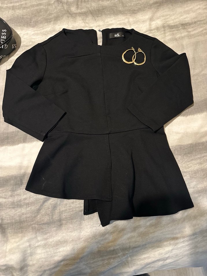Kadınlar için siyah renkte, keten kumaştan yapılmış, uzun kollu, yuvarlak yakalı ve kemerli kısa ceket. Ofis kullanımı için uygun, bol kesim.
