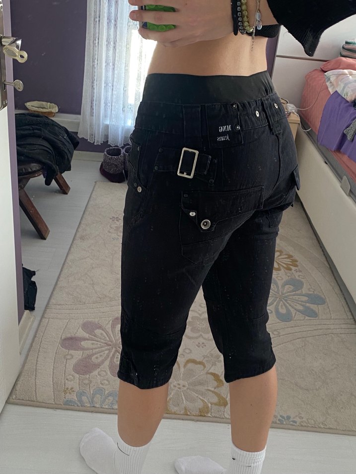 Kadın Siyah Kemerli Kısa Denim Pantolon Kapri Vintage y2k