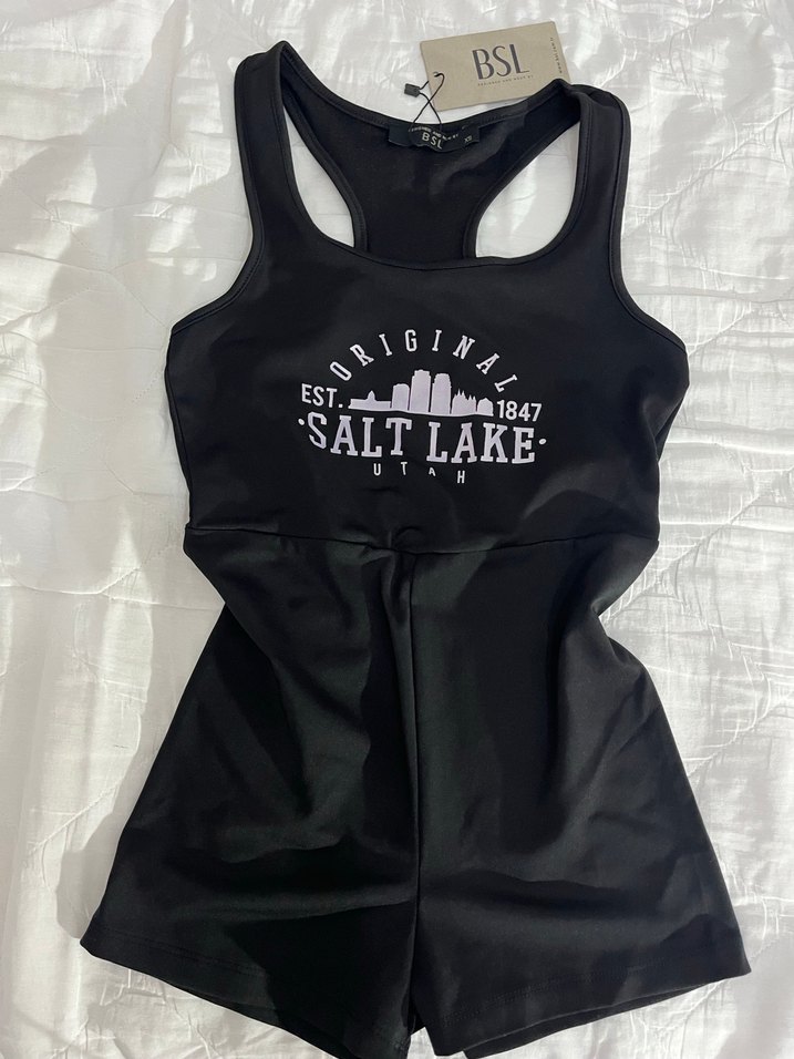Siyah,sırt detaylı ve baskılı Salt Lake desenli, sentetik kumaştan kısa tulum. Spor ve günlük kullanım için uygundur.
