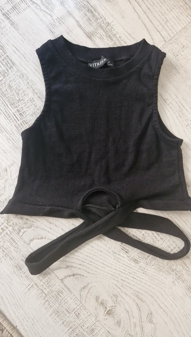 Kemer detaylı, kolsuz ve halter yakalı siyah crop top. Yumuşak sentetik kumaştan, gündelik dış mekan kullanımı için uygun.