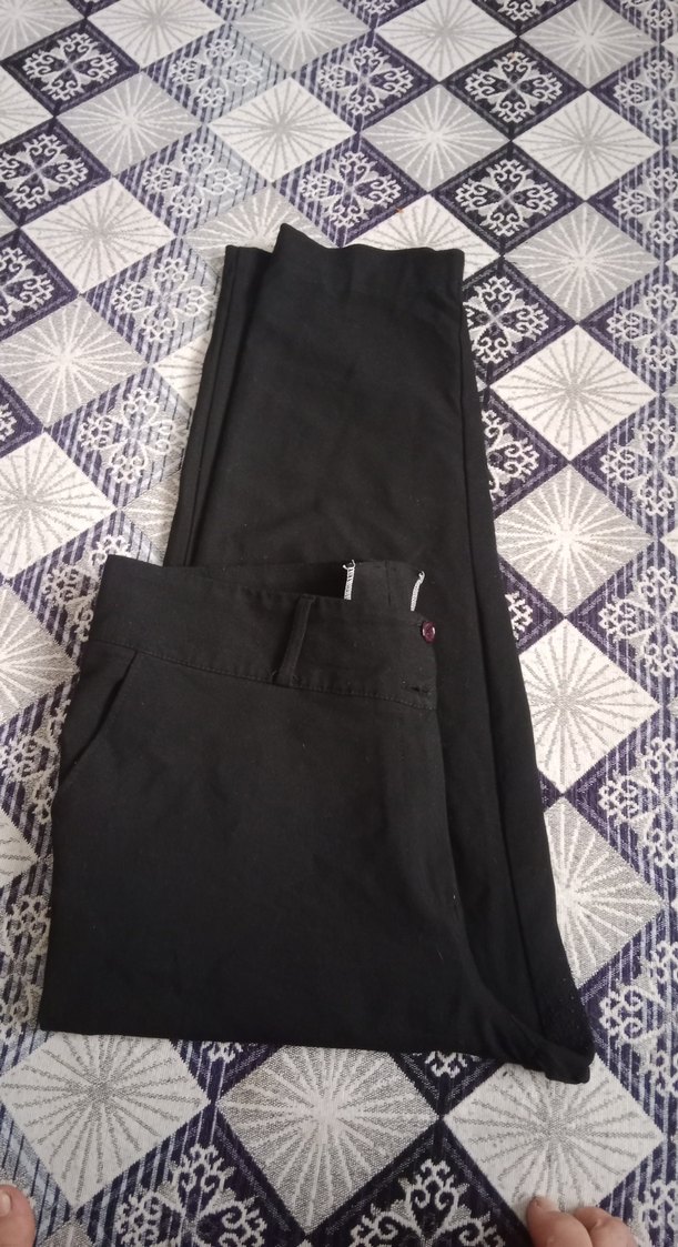Kadınlar için siyah, kemerli, normal boy midi kumaş pantolon. Rahat kesimli, sentetik kumaştan, günlük ve iş stiline uygun.