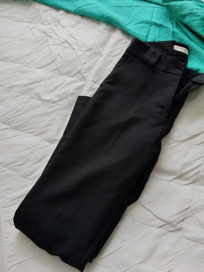 Kadınlar için siyah, kemerli, normal kesim midi boy kumaş pantolon. Minimalist ve desensiz tasarımı günlük kullanıma uygundur.