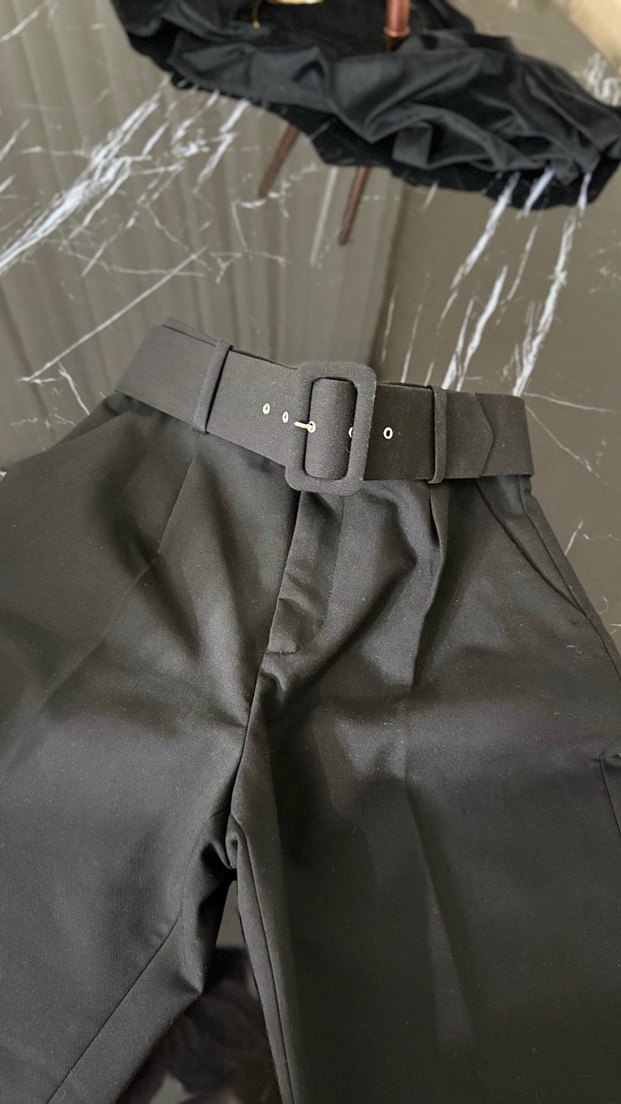 Bir kez giydim ufacık dikişi atmış fiyatı uygun tutuyorum Kadınlar için kemerli, regular fit siyah sentetik kumaş pantolon. Minimalist, desensiz tasarımıyla günlük kullanıma uygun.