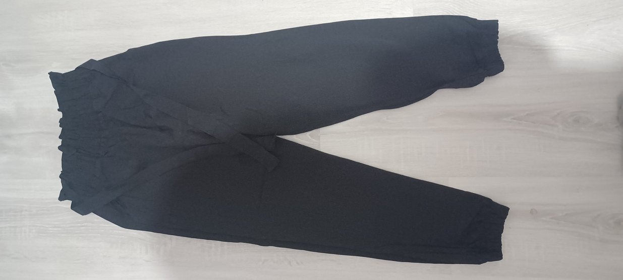 Kadınlar için siyah kumaş pantolon, normal kesim ve kemerli bel detayına sahiptir. Midi boyda, minimalist ve normcore tarzda, ofis kullanımı için uygundur. Yumuşak sentetik kumaştan üretilmiştir.