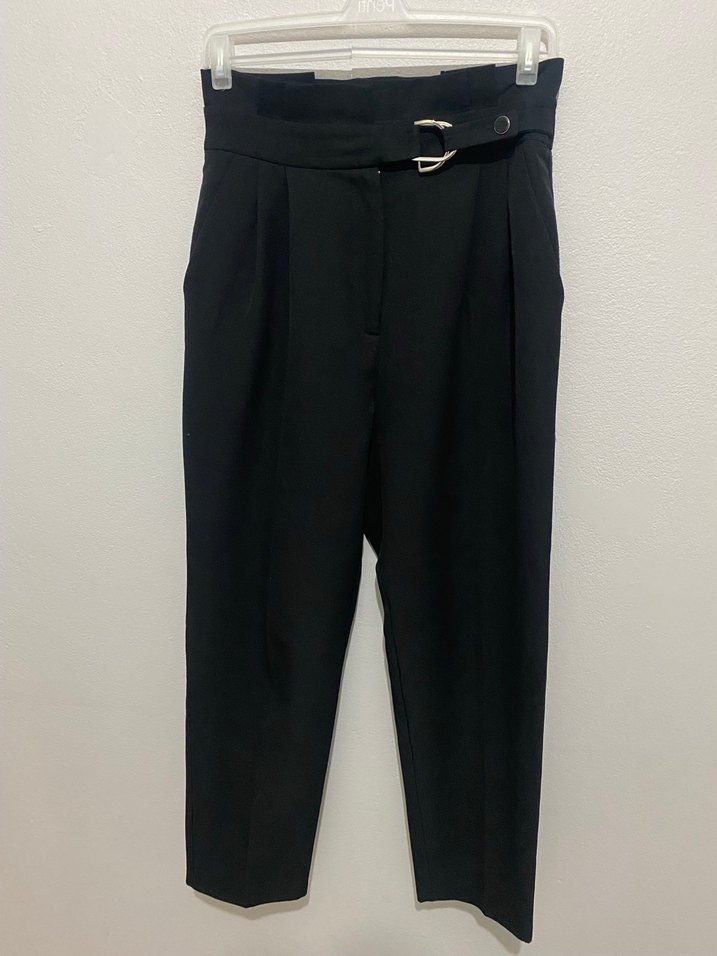 Kemer detaylı, regular fit kadın siyah kumaş pantolon. Ofis için uygun, düz ve şık görünümlü, sentetik kumaştan üretilmiştir.