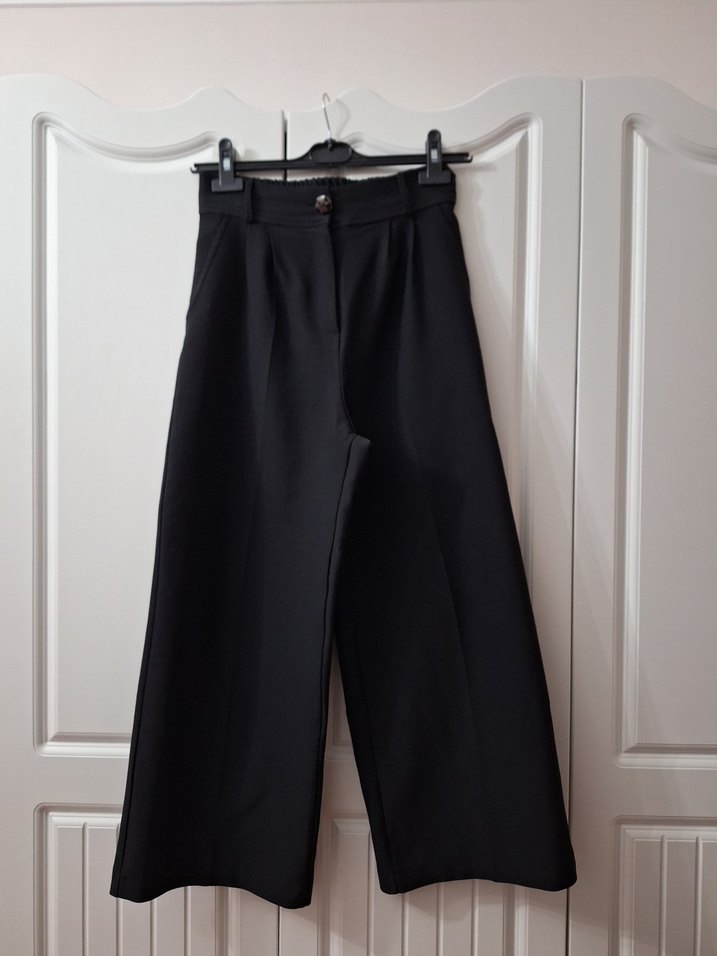 Kadınlar için siyah, kemerli ve midi boy kumaş pantolon. Regular fit kesime sahip, ofis ve günlük kullanıma uygun düz ve şık tasarım.