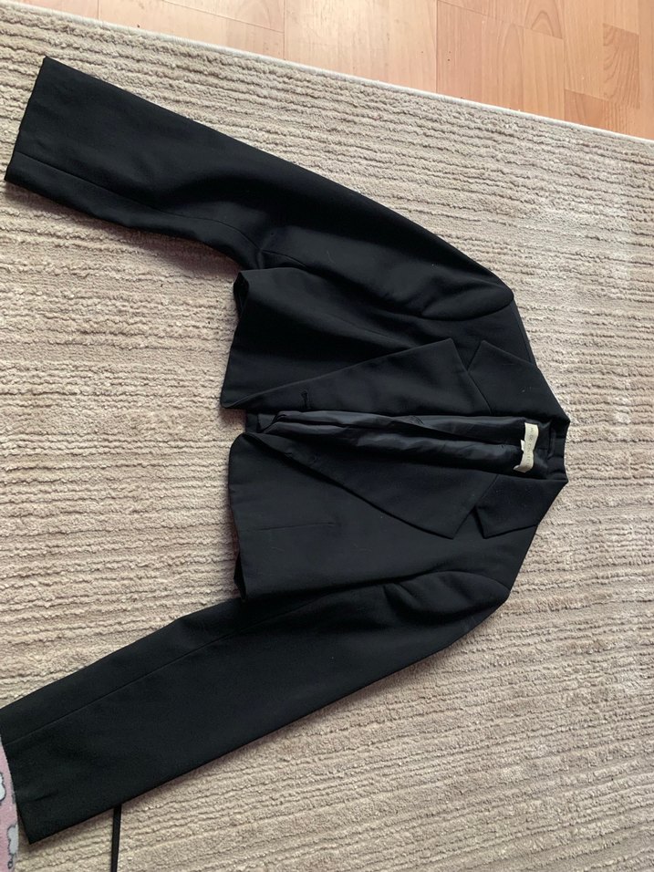 Kadın siyah blazer, kemerli ve dar kesimli. Notch yakalı, uzun kollu ve midi boyda, yumuşak sentetik kumaştan üretilmiştir. Sadece bir kez giyildi yeni gibi tertemiz.