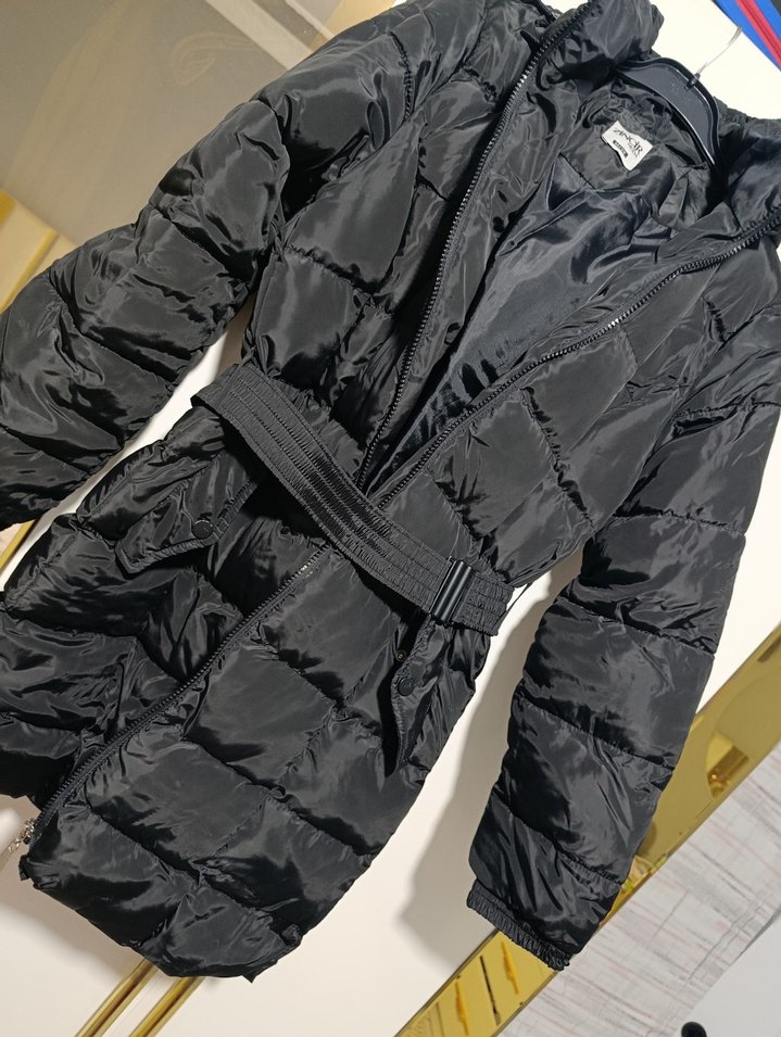 Siyah renkli, kemerli ve fitted kesim kadın kışlık mont. Notched lapel yakalı, askılı kollu ve sentetik kumaştan, günlük kullanıma uygun rahat sokak stili.