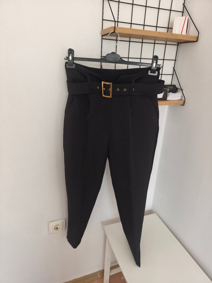 Kemerli bel, düz kesim ve siyah renkte midi uzunlukta kumaş pantolon. Ofis ve günlük kullanıma uygun. M beden