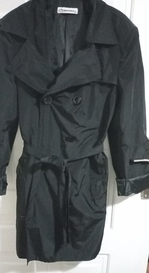 Siyah kemerli, kesim oturan midi trençkot, klasik yakalı ve askılı kollu. Yumuşak sentetik kumaştan, gotik tarzda.