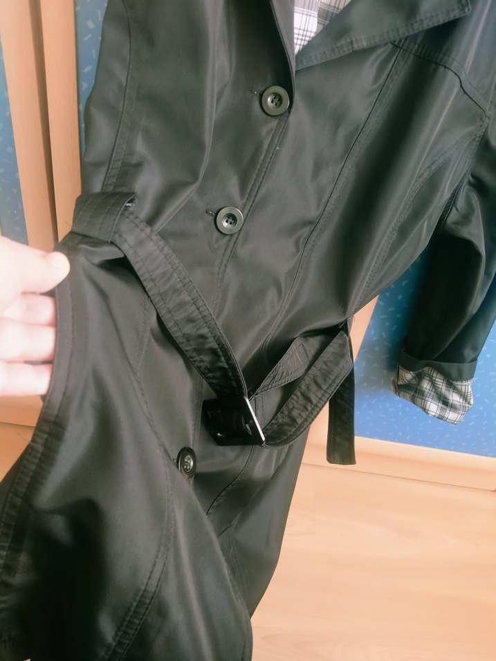 Kadın siyah kemerli midi trençkot, yakası kesimli ve askılı kollu, sentetik kumaştan. Kemer detayıyla şık bir siluet sunar, günlük sokak stili için uygun. En 65 boy 90 cm.