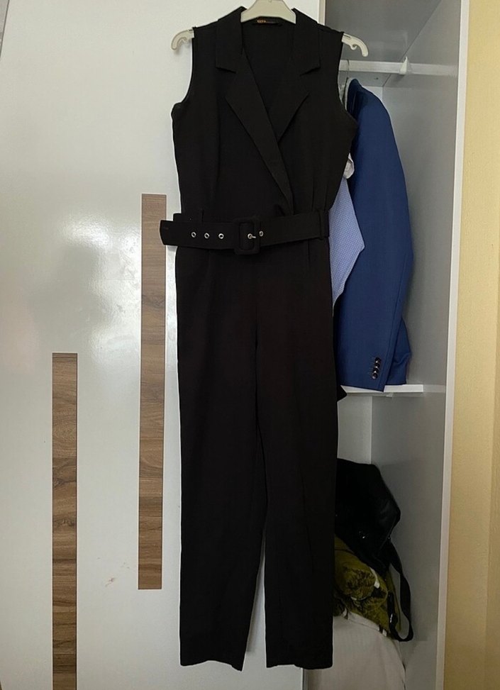 Kemerli ve kolsuz siyah tulum, notched lapel yaka ve midi boy ile. Rahat kesimli, sentetik kumaştan, ofis ve günlük kullanıma uygun.
