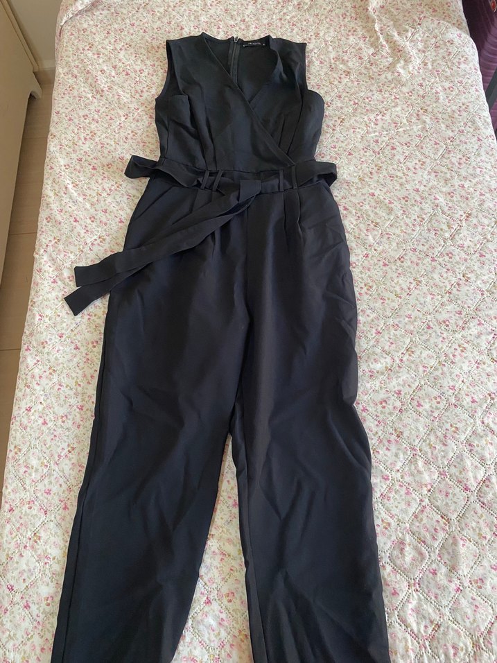 Kadın siyah tulum, kemerli ve v yaka detaylıdır. İnce askılı, midi boyda ve şık sokak stiline uygundur. Rahat sentetik kumaştan üretilmiştir.