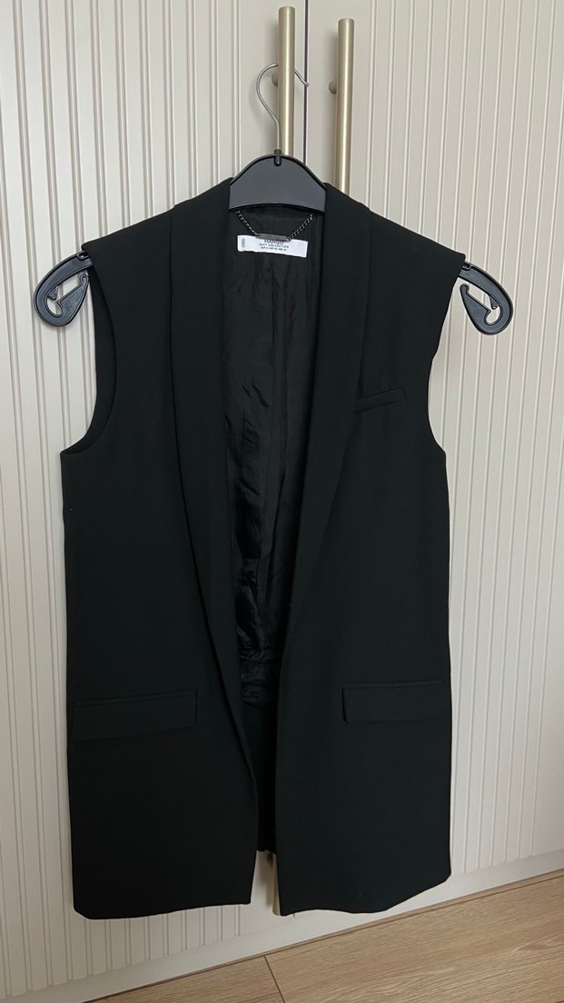 Kadın siyah yelek, kemerli ve kesik yakalıdır. Düz, sentetik kumaştan yapılmış, regular fit ve kolsuzdur. Ofis ve günlük kullanıma uygundur.