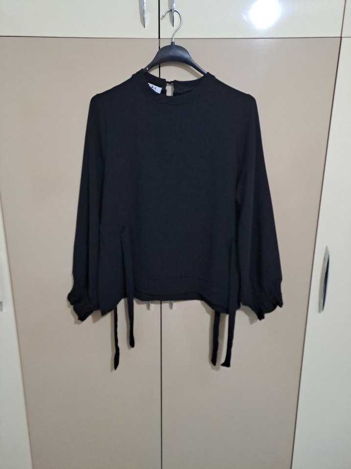 Siyah, uzun kollu, yuvarlak yakalı ve bol kesim kadın bluz. Kısa boylu, kemerli detaylı, yumuşak ve sıcak kumaştan, gündelik kullanıma uygun.