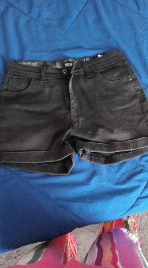 Siyah, kemerli ve mini kesim fit denim şort. Günlük kullanım için uygundur ve desensizdir.