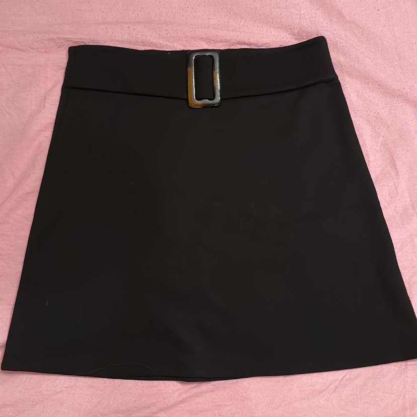Siyah, kemerli, vücuda oturan midi mini etek, ofis kullanımı için uygun.