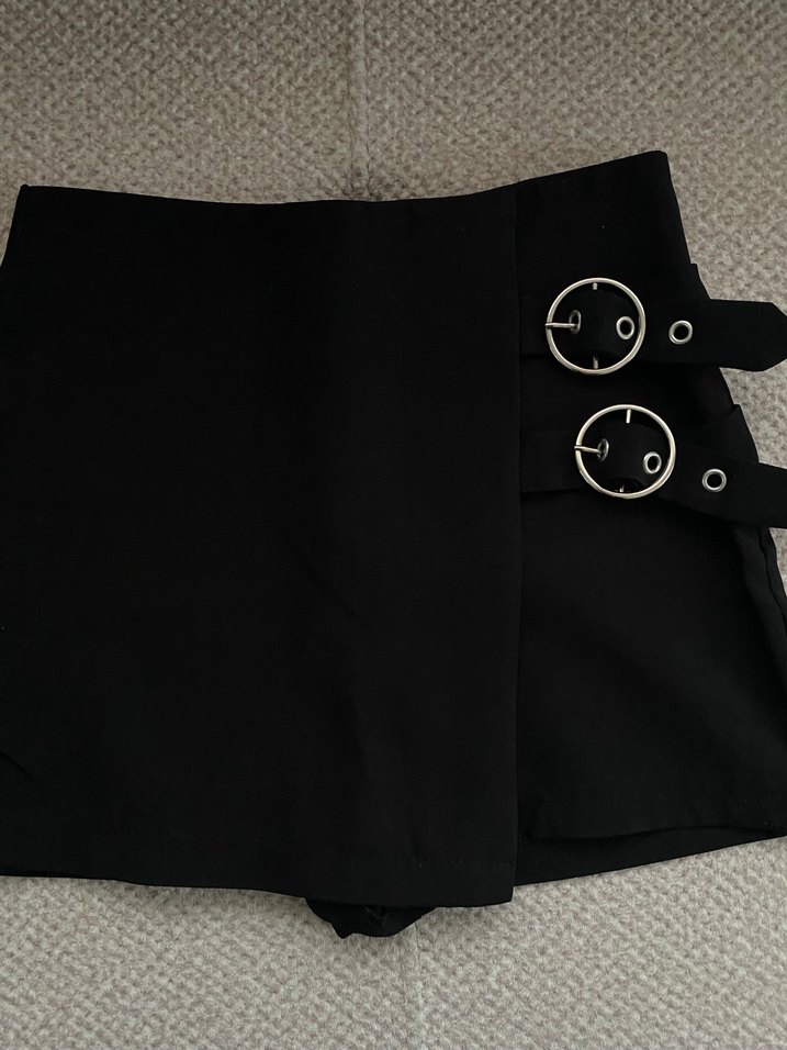 Siyah, kemerli ve tokalı, dar kesim mini etek. Düz, sentetik kumaştan, gotik tarzda romantik akşamlar için uygun.