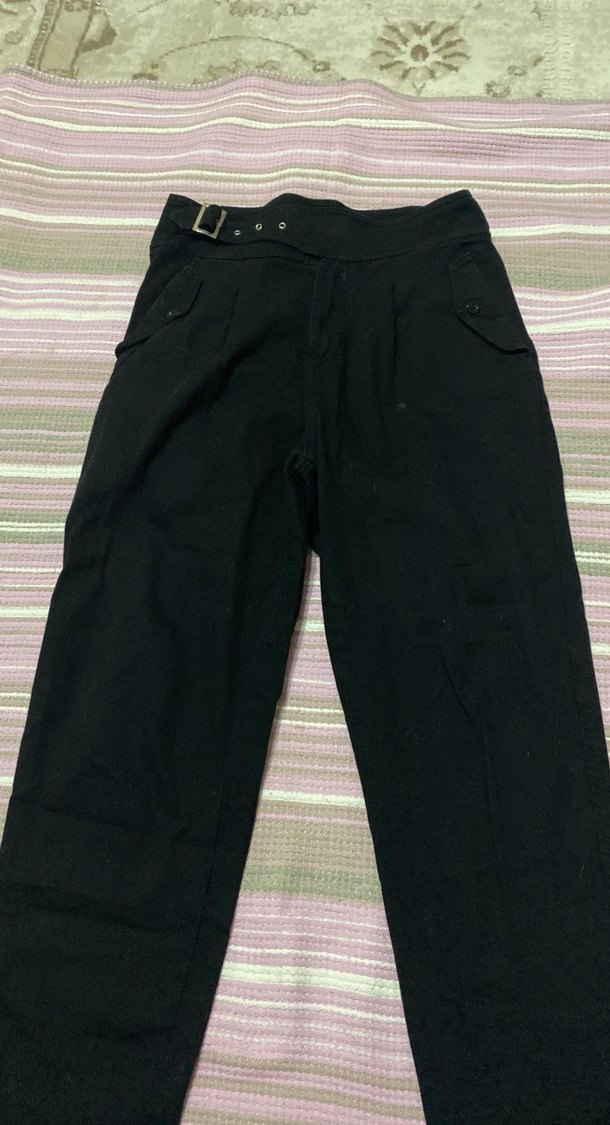 Kadınlar için siyah pamuk kumaştan, kemerli ve yan cepli, midi boy ve regular fit pantolon. Rahat sokak stili için uygundur.