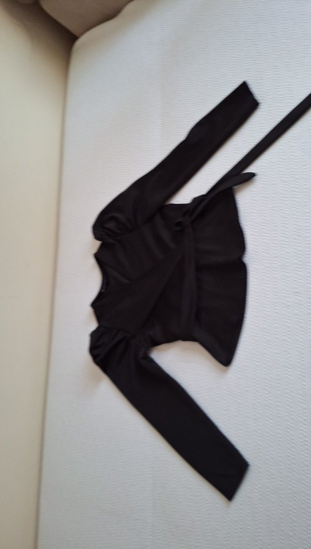 Bu kadın siyah bluz, kemerli bel ve yüksek yakası ile sıkı bir kesime sahiptir. Uzun kollu ve düz renkli, sentetik kumaştan yapılmıştır. Gündelik kullanıma uygundur.