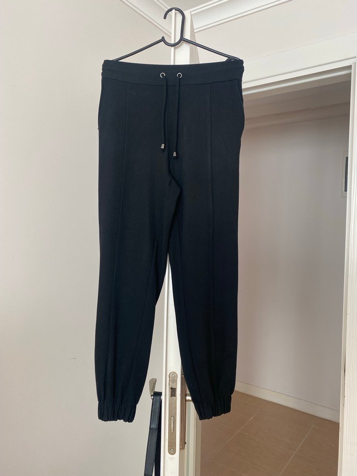 Kemerli ve lastikli paçalı, siyah renkli, yumuşak ve sıcak dokulu kadın spor pantolon, ofis ve günlük kullanıma uygundur. Cep detaylı Arzu sabancı koleksiyon tasarımı bel lastikli 33 basen 49 uzunluk 100 cm