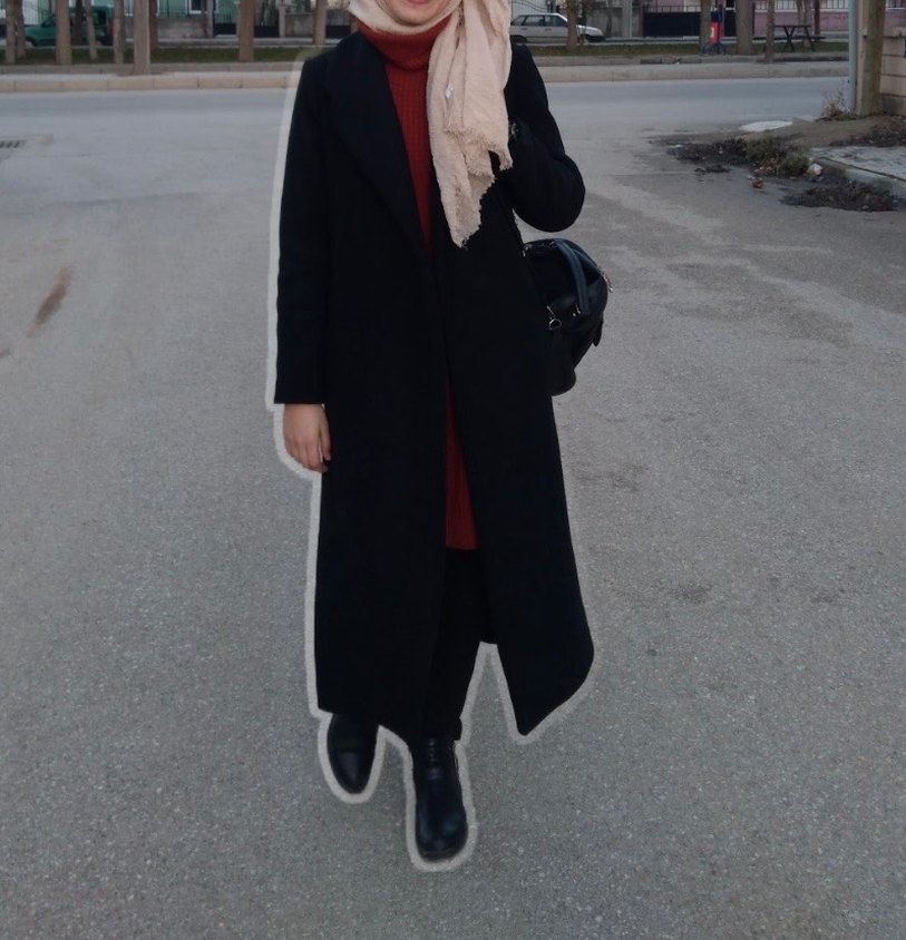 Kadın siyah kaban, uzun boy, kemerli ve kesimli yaka detayına sahiptir. 1.72 buyumda giydim diz altıma geliyor tam