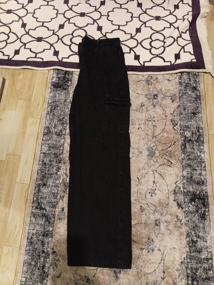 Kadınlar için, siyah renkli, kemerli ve uzun paçalı kot pantolon. Sentetik kumaştan üretilmiş, günlük kullanıma uygun.