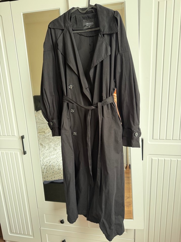 Siyah kemerli, uzun kollu, bol kesim trençkot. Yaka detayları ile şık astarını terzide ben çıkarttırdım yazın giyebilmek için o kadar. Defosu yoktur
