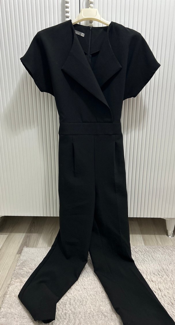 Kadın siyah tulum, kısa kollu ve yakalıdır. Kemerli ve düz kesim, ofis için uygun, sentetik kumaştan yapılmıştır.