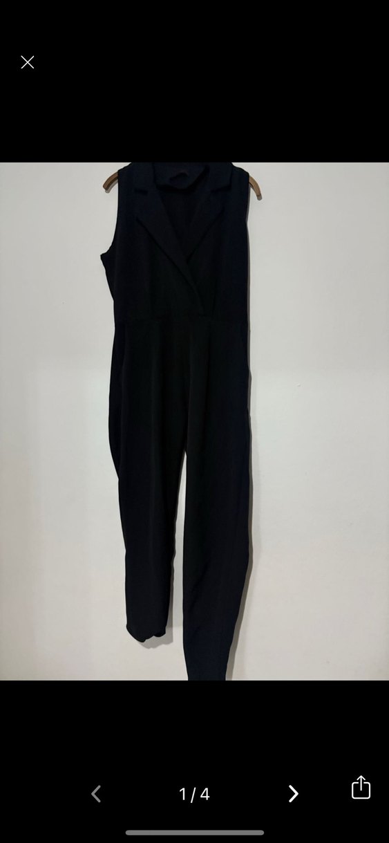 Siyah, kemerli, kolsuz uzun tulum. Çentikli yaka ve regular kesime sahip, ofis için uygun sentetik kumaş.