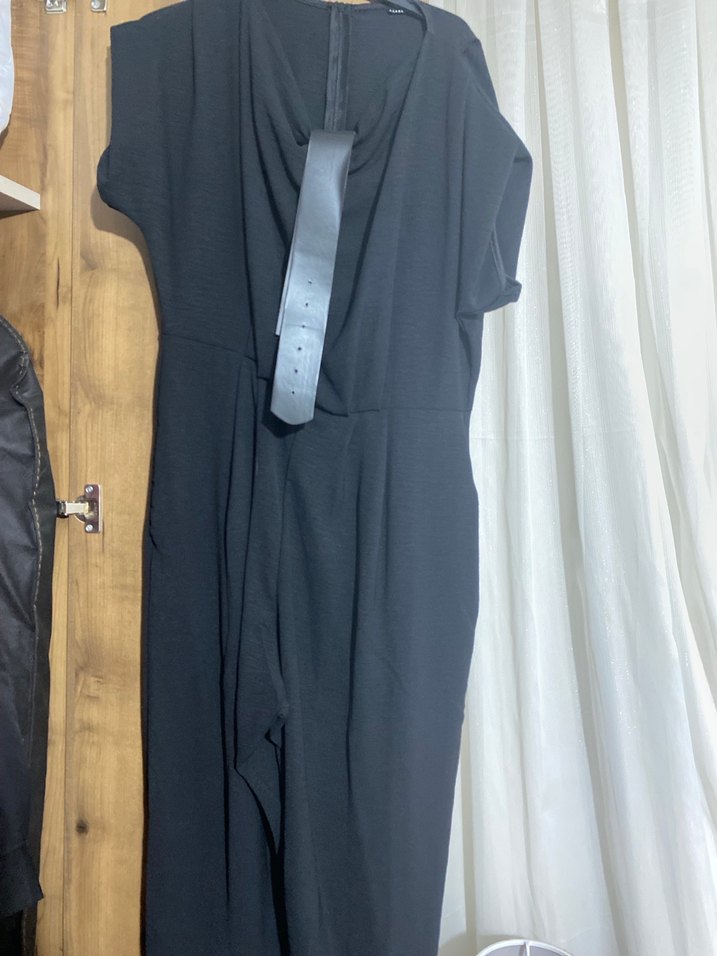 Siyah, kısa kollu, yakalı ve kemerli uzun tulum. Sentetik kumaştan, regular fit kesimle ofis ve sokak stiline uygun.