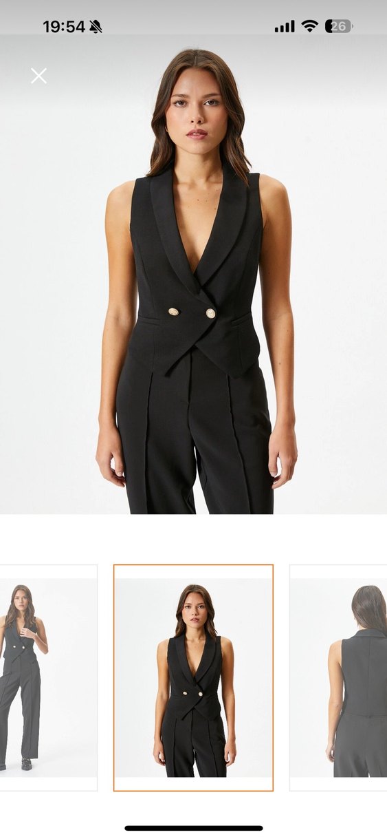 Kemer detaylı, V yaka, kolsuz siyah yelek. Normal kesim ve midi boyda, ofis kullanımı için uygun şık bir parça.
