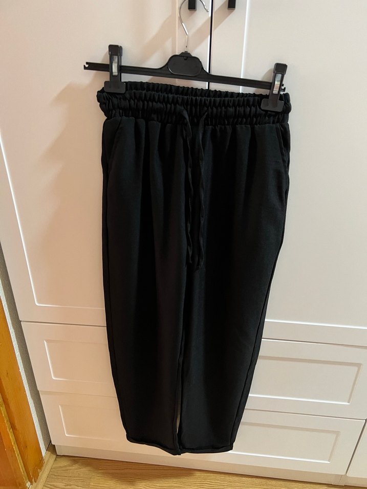 Kadınlar için siyah keten kumaştan, beli kemerli, bol kesim midi boy pantolon. Rahat ve trend athleisure tarzını yansıtır.