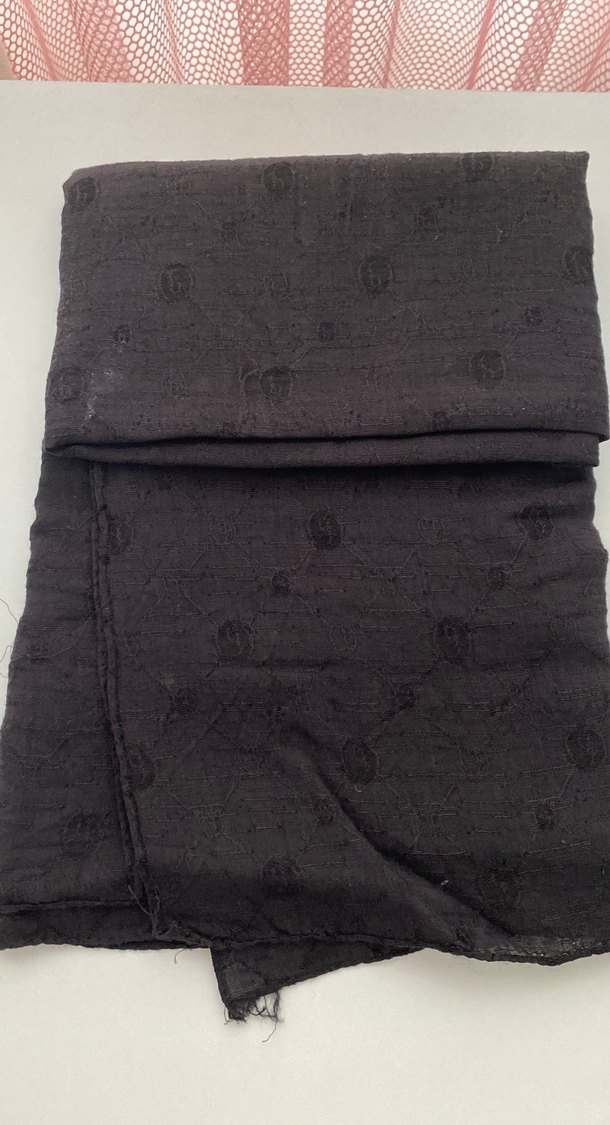 Bu siyah keten şal, drapeli tasarımı ve ince dokulu desenleriyl minimalist goth ve bohem tarzına uygundur.