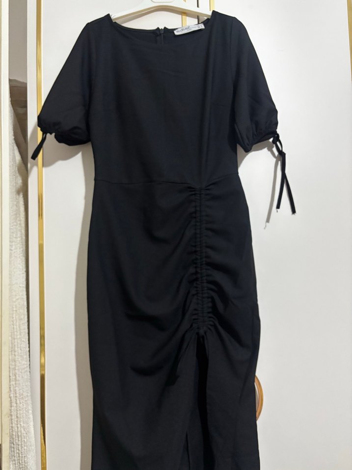 Yeni hiç giyilmedi midi boy drapeli detaylara sahip, kısa kollu ve bisiklet yaka midi elbise. Ofis için uygun, minimalist ve şık bir tasarıma sahiptir.