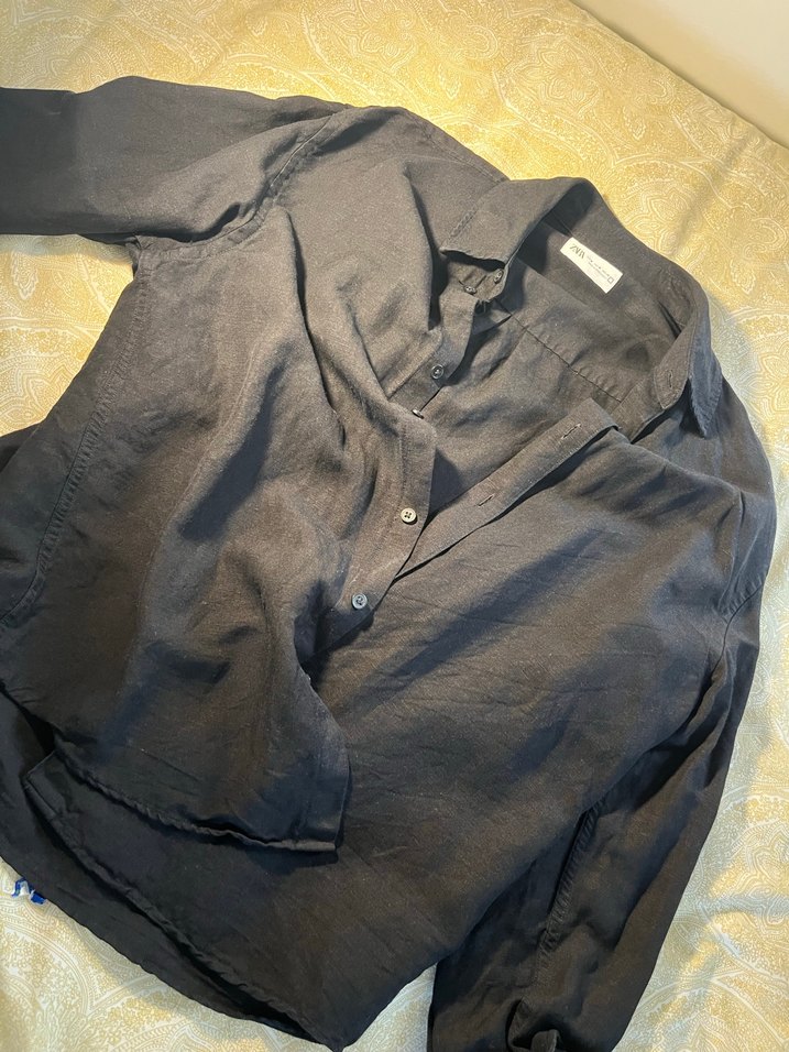 siyah keten gömlek, düğmeli ve kolyeli yakalıdır. Uzun kollu ve salaş kesimdir, günlük rahat kullanım için uygundur.