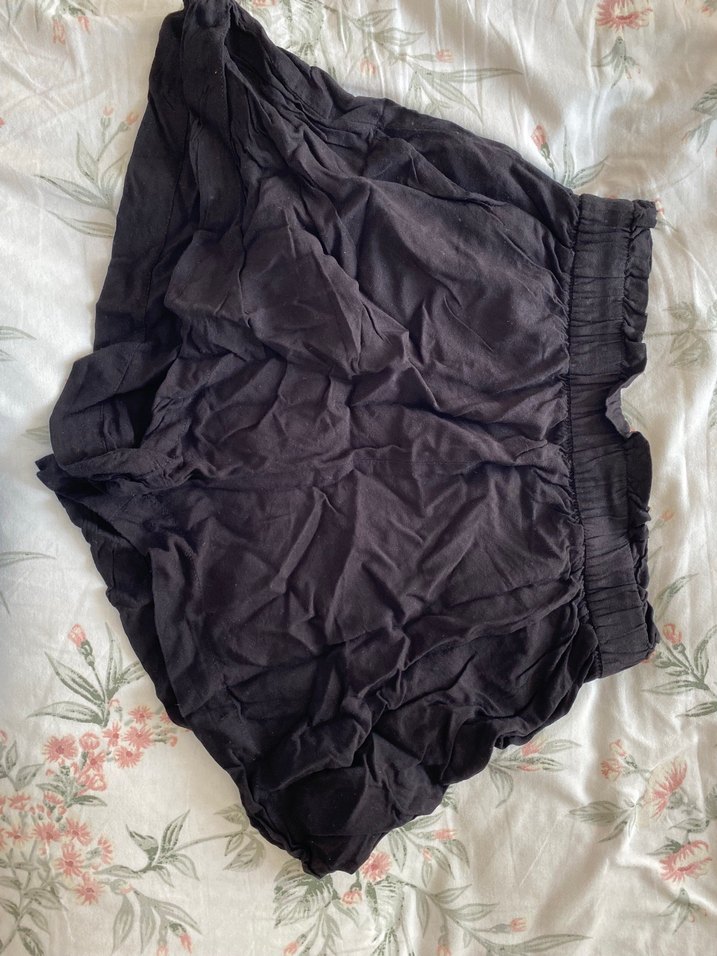 Rahat kesim siyah keten midi şort, bel kısmı lastikli şort. Minimalist sokak stili için uygun, dış mekan kullanıma uygun.
