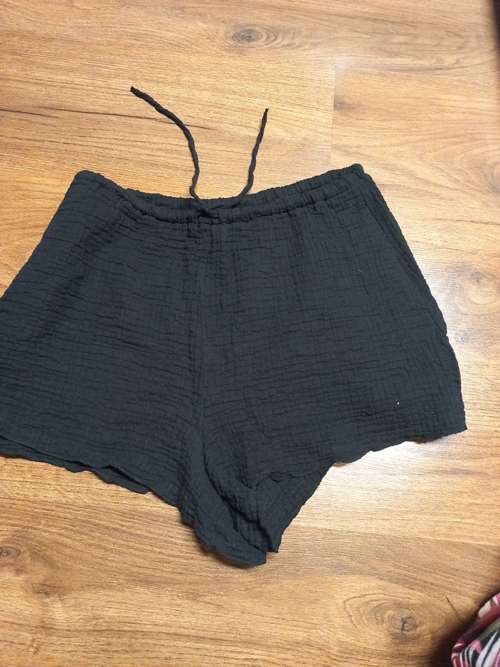 Yumuşak keten kumaştan yapılmış, rahat kesim siyah mini şort. Günlük kullanıma uygun, bohem tarzda sade ve konforlu.