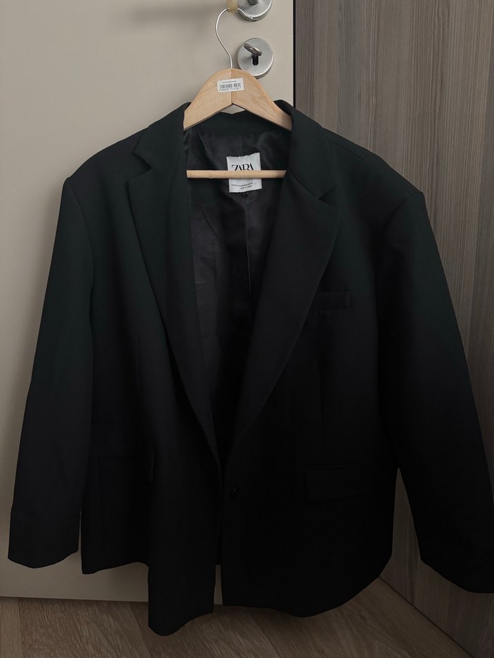Siyah keten kumaştan, notalı yaka ve uzun kollu, düz desensiz, normal uzunlukta ve rahat kesim ofis blazeri.